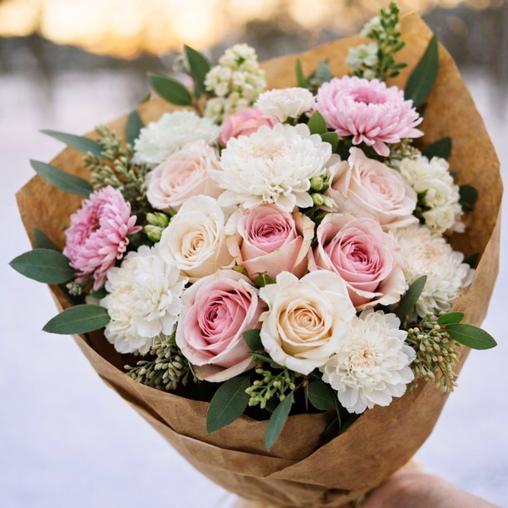 Our Valentine’s Bouquet is a timeless expression of love. Featuring a lush mix of mini pink and white roses, delicate pink and white chrysanthemums, and classic white carnations, this bouquet is artfully accented with complementing greenery. Wrapped in rustic brown craft paper and tied in romantic ribbon, it strikes the perfect balance between elegant and natural.